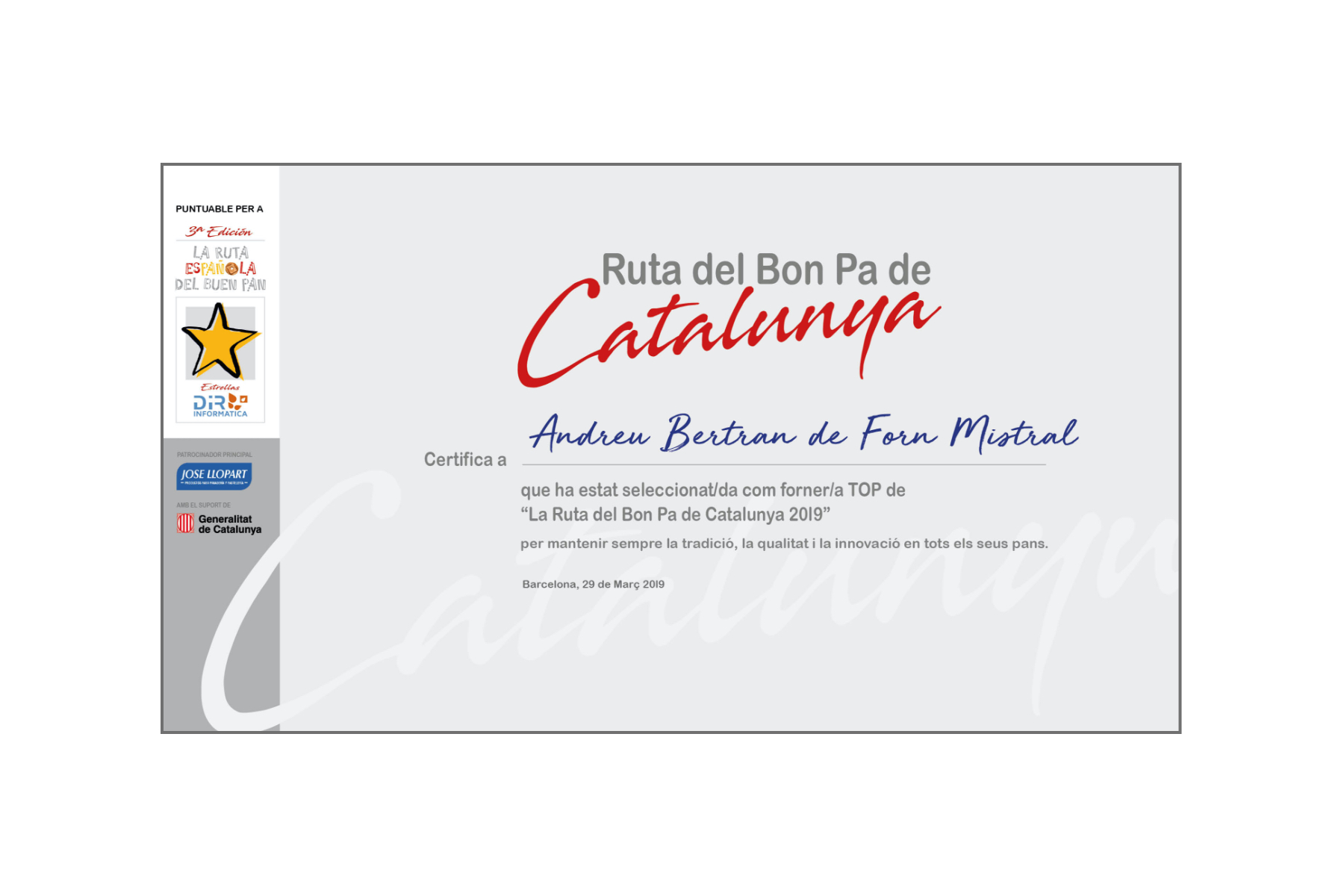 Els anys 2017, 2018 i 2019 ens van donar una Estrella com a Forners TOP de “La Ruta Española del Buen Pan”.